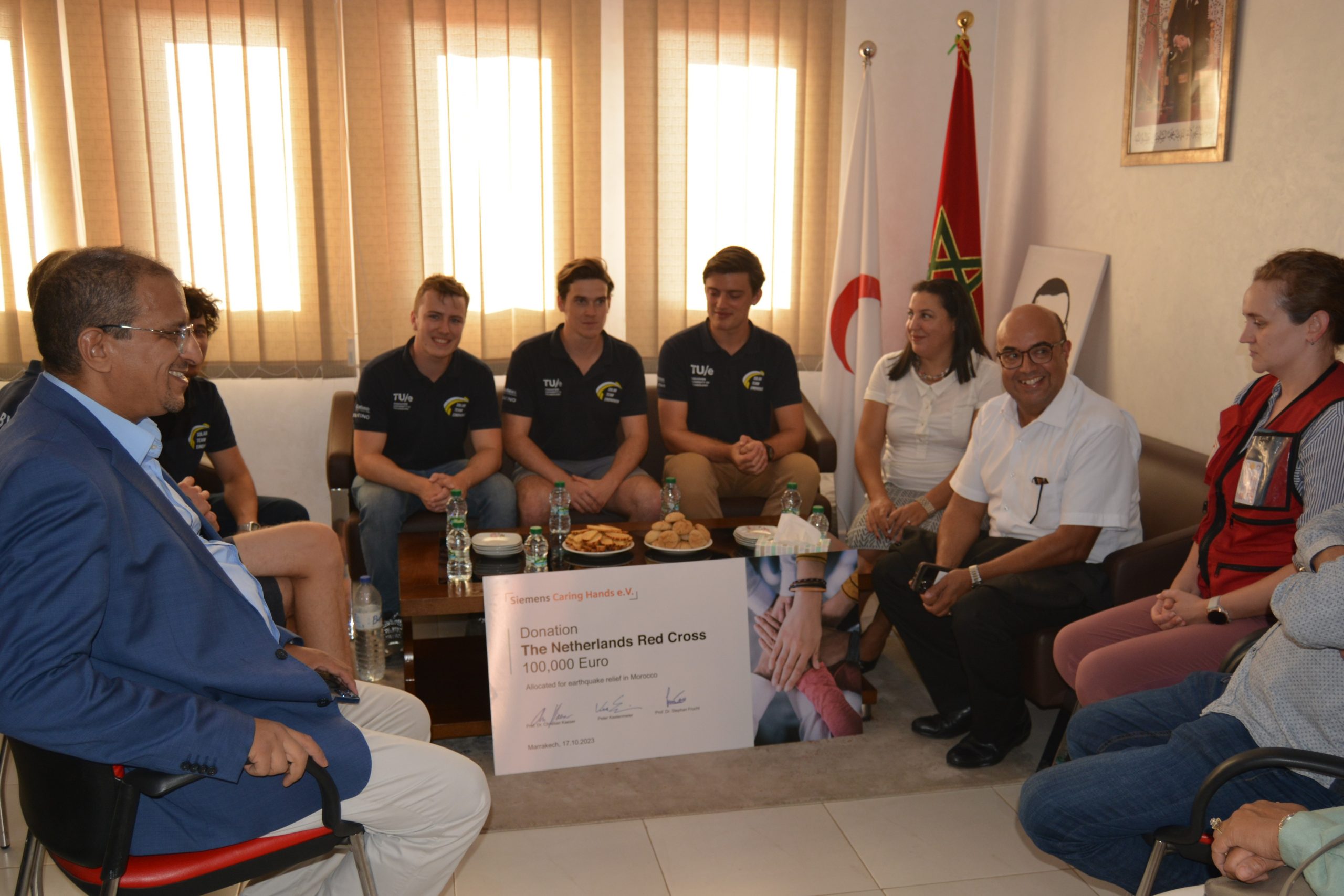 Siemens Mitarbeitende engagierten sich für die Menschen in Marokko mit zahlreichen Spenden an Siemens Caring Hands e.V., die anschließend von Siemens verdoppelt wurden. Vor der Zentrale des marokkanischen Halbmonds trafen sich ein Vertreter der Deutschen Botschaft, das Solar-Team und lokale Medien, um die bedeutende Spende der Mitarbeitenden sowie die besondere Leistung des Solar-Teams zu würdigen.